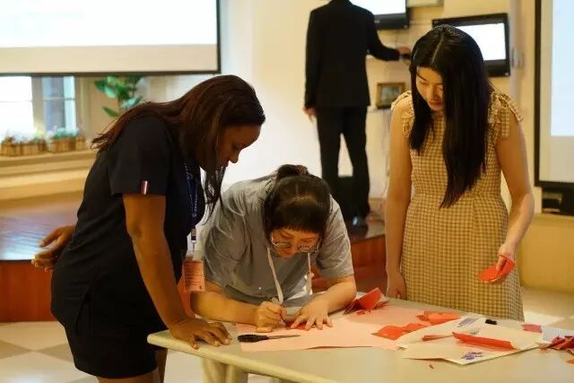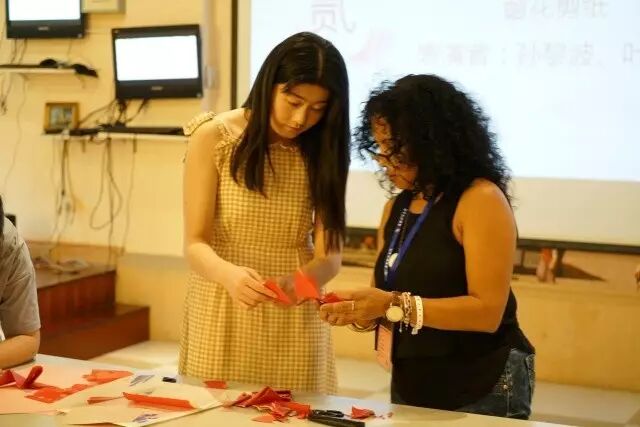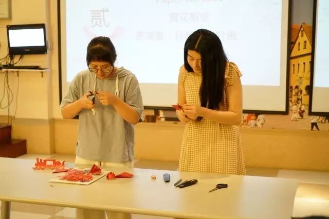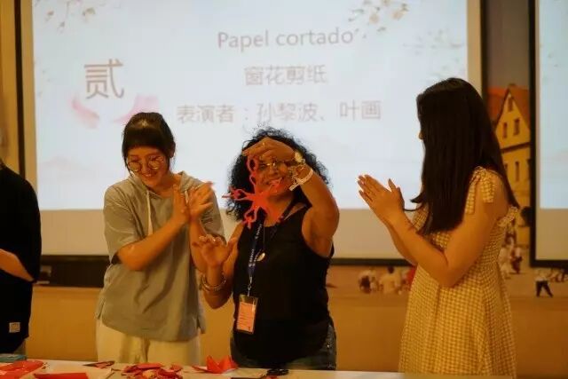 剪纸是我国民间艺术的代表,一把剪刀、一张纸、一双手,可以剪出飞禽走兽、花鸟虫鱼,看着同学的展示,学员们也跃跃欲试,纷纷上台模仿学习,在同学们的帮助下剪出第一幅中国窗花。