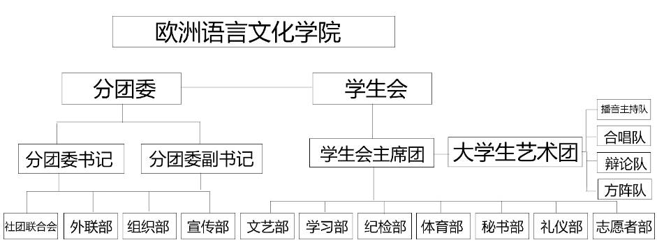 2.负责活动总结报告的汇总和整理工作。 3.负责学生会每次例会的内容记录,建立、保存档案资料。 4.负责团委学生会所有活动的现场拍摄、后期推送制作。 5.负责活动所需的宣传单的设计,ppt以及视频的制作。 6.负责学生会微信网络平台的管理。 如果你对新媒体运营感兴趣;如果你文风犀利有自己独到的见解;如果你有摄影爱好;如果你在电脑方面有一技之长。 无论你是全方面的人才,还是单方面的人才,只要你愿意,我们在这等着你! 学习部主要负责一些活动的策划统筹,活动安排与记录,各类的文稿工作以及易班。在筹办各类学习活动(实训周以及各类比赛活动等)的同时,帮助同学们更好的融入大学生活,在活动中提高自信。培养一定的书写能力,口语表达能力以及为同学们提供一个充分展示自我的平台。最后,学习部时刻欢迎各位同学的加入! 欧洲语言文化学院组织是团委学生会的服务部门,是协助团委加强全院共青团思想建设,组织建设及共青团干部培养和管理的重要职能。 “无规矩不成方圆。”一句老话,孕育着一个无处不在的词:纪检。没有纪律,何来自由。 接下来,带你走近纪检,走进纪检,看到一个更多元化的纪检部。 部门主要职责: 1.全体大一的早自习及晚自习考勤。 2.各个班级与宿舍的卫生检查。 3.考勤表及卫生表的统计整理工作 。 @欧洲语言文化学院社团联合会。 社团联合会简称社联,是团委领导下的组织,以服务社团,服务同学为宗旨,主要负责社团的注册,报销,活动的审批,记录,协助社团开展活动等。 这里有各种让你大学生活充实的工作,这里有各种让你欢笑不断的社联活动,这里还有你们自己因志同道合而结识的小伙伴们。 相信你来了绝不会后悔。风里雨里,社联等你。社联需要新鲜的血液给它注入更大的能量。还在等什么,各位小可爱赶紧加入我们吧~ 欧洲语言文化学院也本着“我奉献,我快乐”的志愿者服务精神大力倡导学生积极投入到志愿者服务中,为构建和谐社会,和谐校园推进精神文明建设,做出贡献。 志愿者部现工作主要分为两部分: 一.社会志愿者活动 : 1.上海科技馆志愿者活动 2.上海市浦东新区气象局志愿者活动 3.南汇古钟园志愿者活动 4.社区养老院志愿者活动 二、校内志愿者活动:协助各部门开展每一个活动,如“欧语文化月开幕式”“欧院美食节”“欧洲语言文化学院外文诗歌朗诵”等等。 在团委学生会领导之下负责院文艺活动工作的专门职能部门,以“活跃校园文化气氛,丰富光的同学业余文化生活”为宗旨。 部门职责: 1.积极参与举办各类院文艺活动,活跃学生的文化艺术生活。 2. 认真参与、开展各类校园文化艺术节,配合学校相关部门,做好迎新晚会,元旦晚会等大型庆典和庆祝活动的准备和组织工作。 3.组织编排文艺节目,积极参加校内外各种文艺比赛,力争取得好成绩。 4.负责有文艺特长的同学的挖掘、统计、存档、推荐工作。 5.努力完成学院、团委和学生会主席团及部长交给的其他任务。 体育部作为我院的日常管理部门之一,它的任务就是组织学院各项体育活动,同时协助学院其他部门对学院的一些日常事务进行管理。 欧洲语言文化学院宣传部是院团委学生会直接指导下的部门,作为学生工作的窗口,起着对内宣传学院动态和对外展示学院风貌的职责宣传部作为学生会的重要宣传部门,其本身也组织、开展有关的艺术创作活动。我院宣传部用最美的色彩,最赋灵气的字,传达画的真实情感。将美与生活结合,将生活与美互融,用最美的色彩做出最好的宣传。 负责与外校联系,把外校的成功的管理经验和优秀的活动引进,为其他各职能部门提供信息支持。通过联谊、交流等形式与社会各界建立广泛的联系,增强社会各界对我院的了解。 合唱队主要负责配合文艺部进行欧院大型活动的表演节目以及院内的“红歌会”节目。